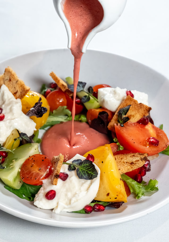Local Greens, Burrata, Pomegranate, Opal Basil, Focaccia Crisps, Pomegranate Dressing