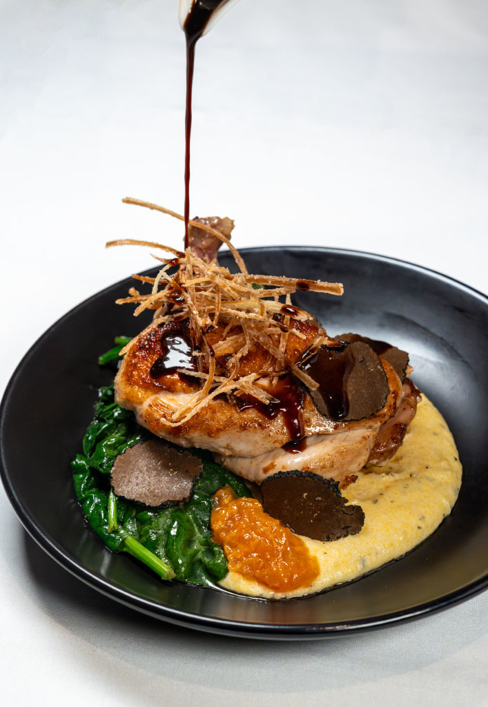 Winter Truffle Polenta, Black Kale, Chicken Jus, Shaved Winter Truffle, Crispy Leek, Persimmon Compote