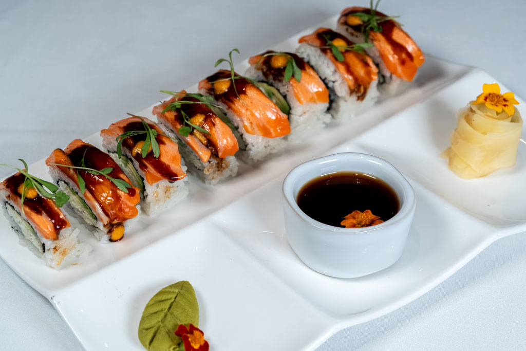 Torched King Salmon Belly, Sushi Rice, Nori, Sweet Soy, Spicy Mayo, Eel Sauce, Avocado