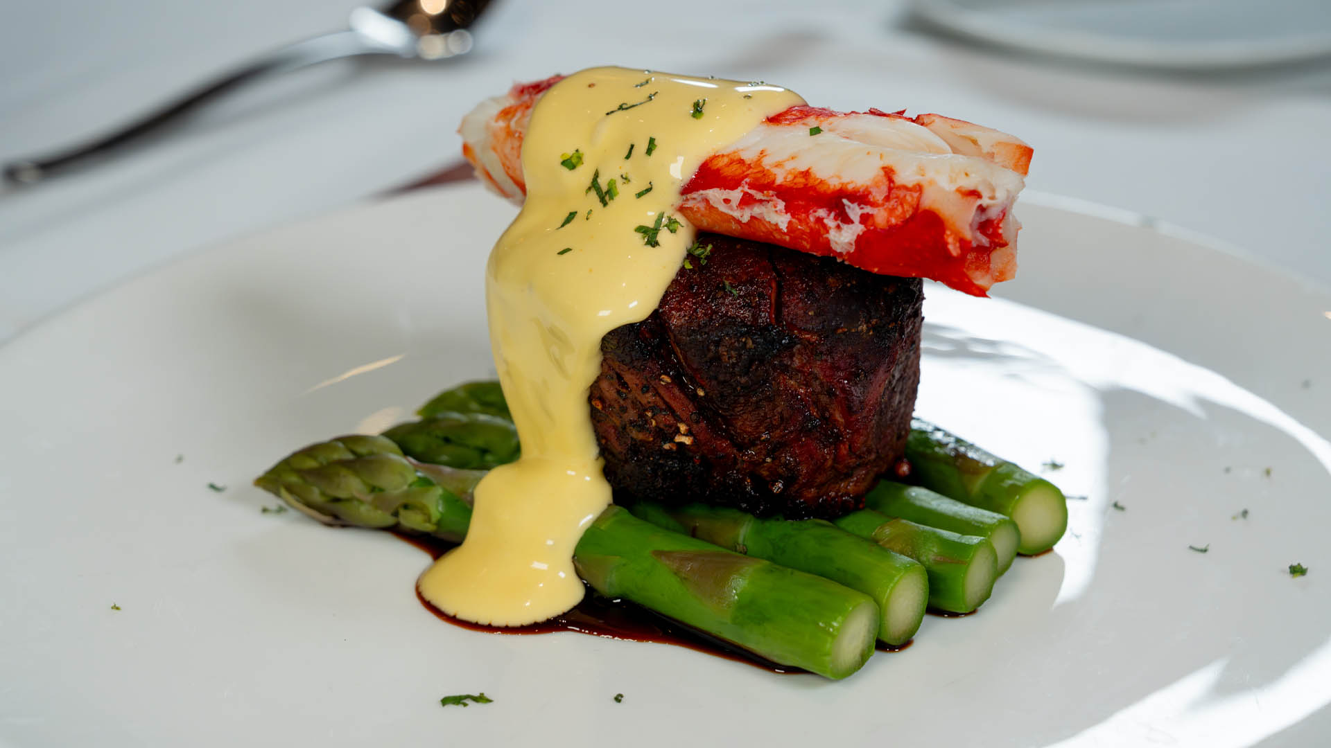 Petite Filet Mignon Topped with King Crab, Asparagus, Bordelaise & Béarnaise Sauce