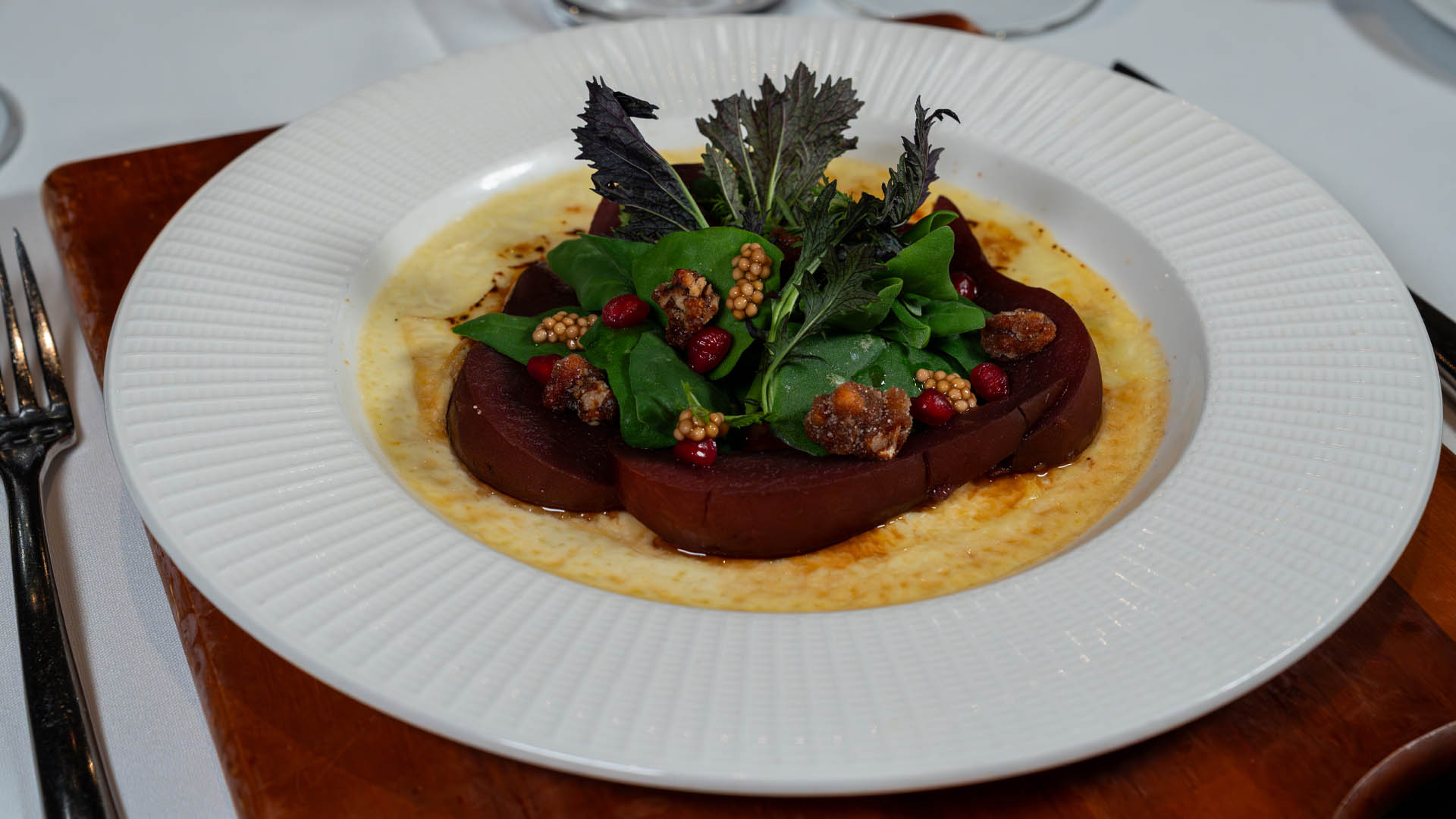 Beluga Lentils, Thumbelina Carrots, Carrot Top Pesto, Fennel Soubise Aleppo, Pistachio Dukkah